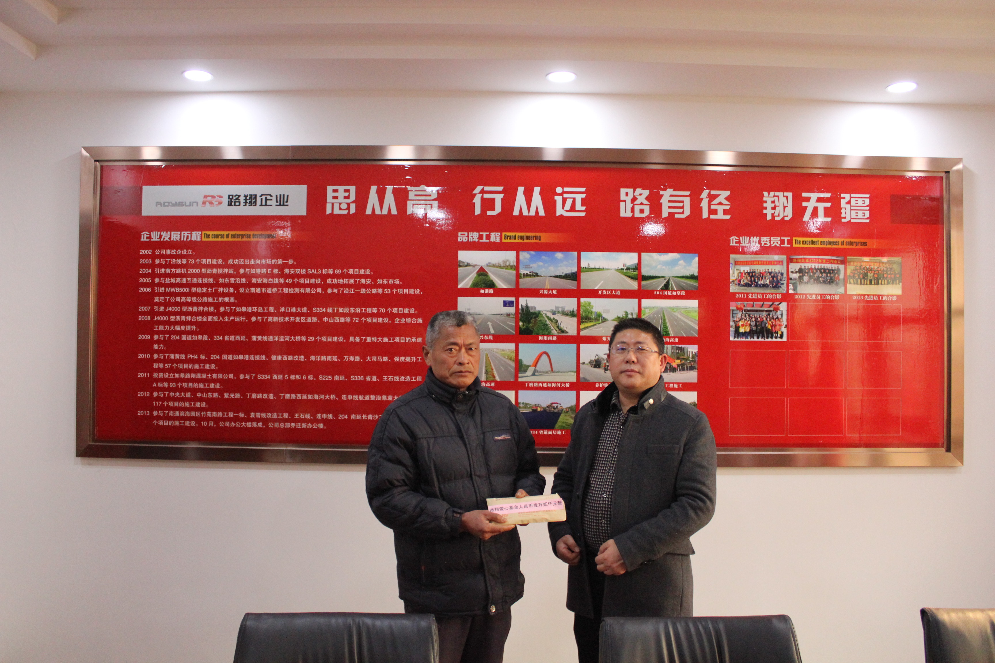 201412月,在市慈善基金會領導的關心和支持下,路翔企業發起成立了路翔愛心基金,專門用于本市地區性的扶貧助困、捐資助學、災害救助、社區建設、傳統文化教育及其他慈善資助活動。“路有徑、愛無疆、翔無涯”,我們堅信:有了路翔愛心基金這個回饋社會的平臺,路翔人一定會將愛的接力棒更好地傳承下去并發揚光大。[總經辦  朱洪鋼]