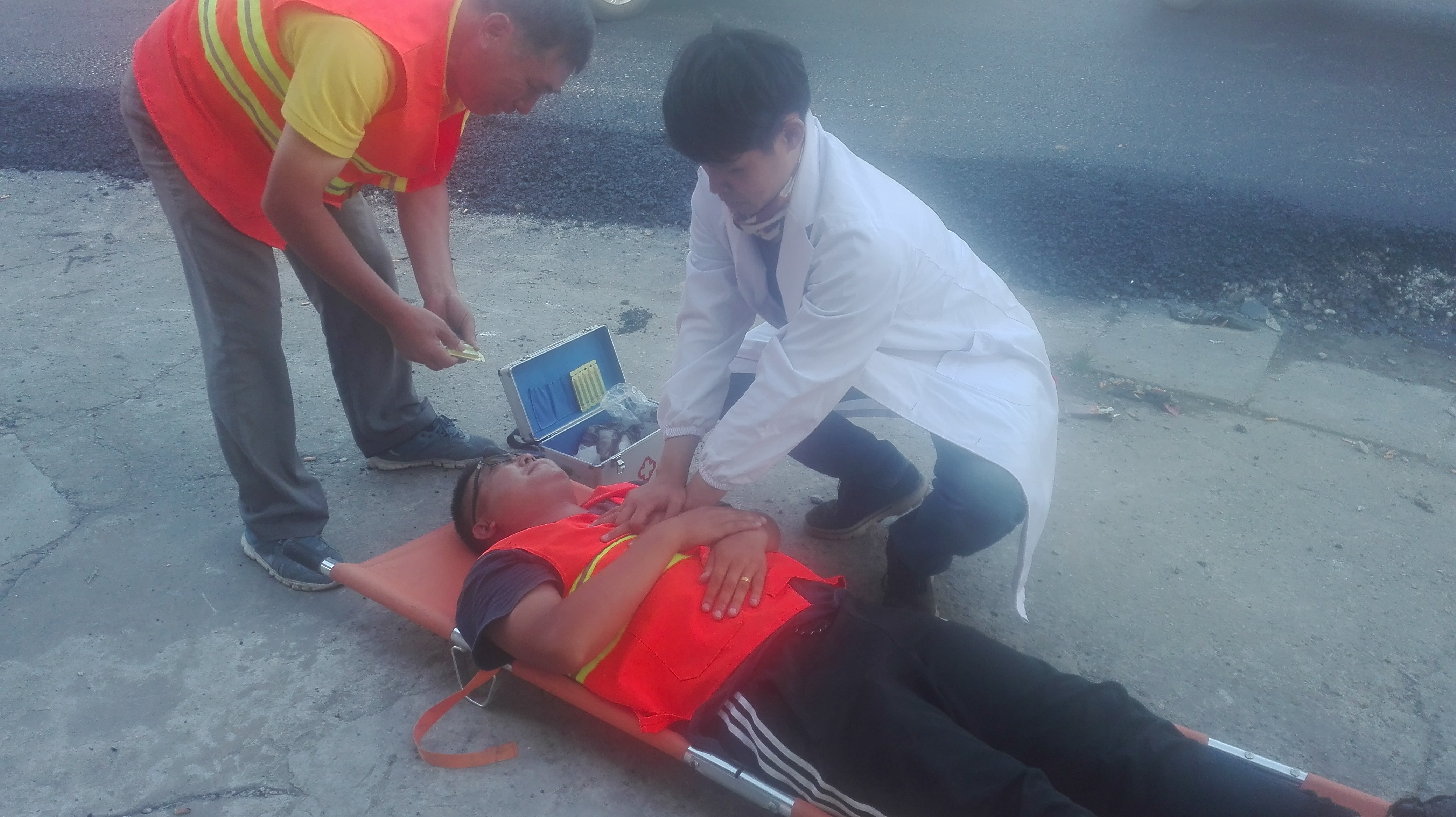 中午12時許,由公司負責人沙海江宣布演練目的、組織紀律和安全注意事項,演練正式開始。施工現(xiàn)場,一名瀝清攤鋪作業(yè)人員出現(xiàn)頭暈嘔吐現(xiàn)象,臉色發(fā)白,情況危急。正在現(xiàn)場巡查的安全員朱凱發(fā)現(xiàn)這一情況后,立即向10m外的施工隊長薛鐵泉求救“隊長,出事了,一名工人頭暈嘔吐,臉色發(fā)白,有可能是中暑了,趕緊幫忙。”